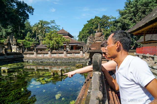 Après seulement une demi-heure de route nous arrivons déjà sur le site du Pura Tirta Empul (15000 IDR soit 1€/p). Il n’est pas très tard, mais le parking commence déjà à se remplir. L’ensemble est très aménagé...